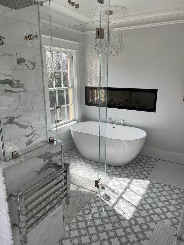 - master bedroom with attached bathroom, including a large soaking tub, large marble-tiled shower, heated floor, sound system, electric fireplace, Toto automatic toilet and separate make-up table
