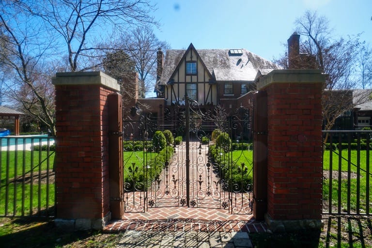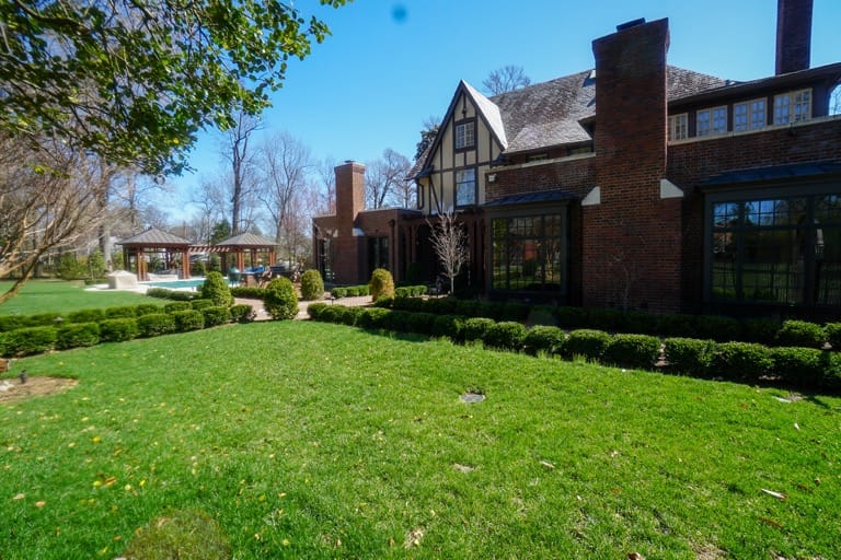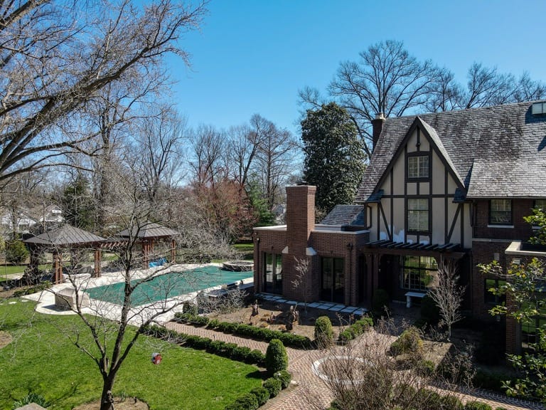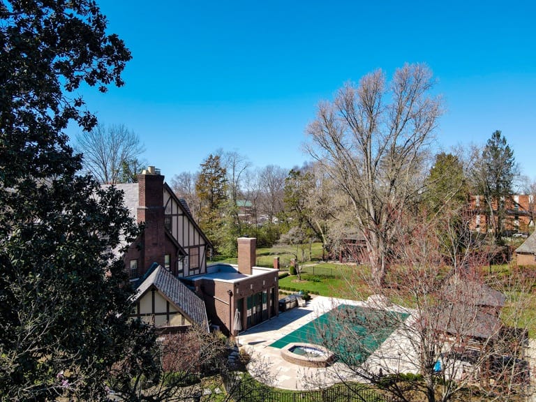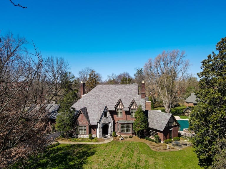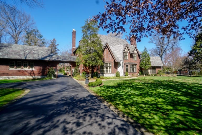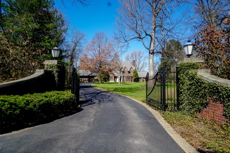 This ultra-private gated estate is located at 3185 Lexington Road. The home is a stunning English Tudor built in 1923, situated on four acres in one of Louisville’s most popular and convenient neighborhoods. Perfect for Derby entertainment, this home combines historic charm with modern amenities.