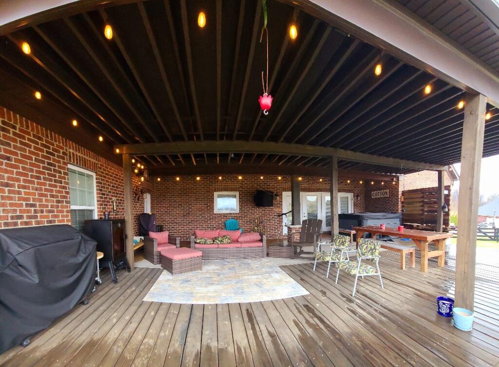- large back patio with furniture and hot tub