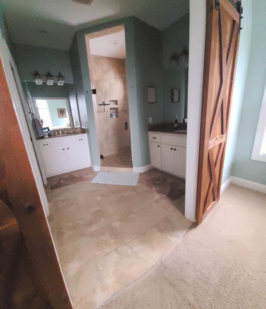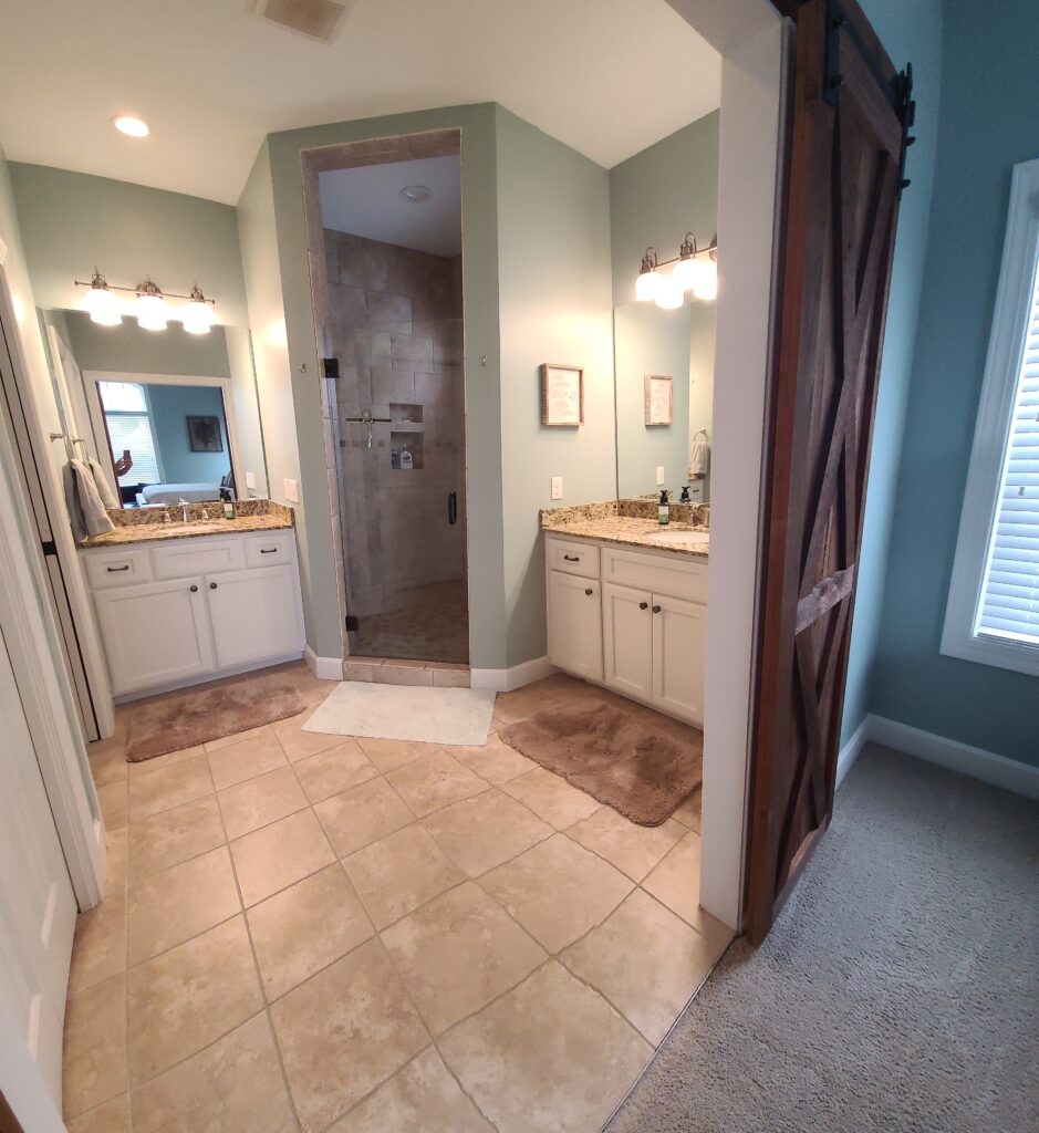 The main floor combines the kitchen, which consists of a large island, dining room and large living room. Additionally, the first-floor consists of the master ensuite which includes a king bed, TV and desk area. The large master bathroom includes a walk-in shower, two separate vanities with private toilet room. Two more carpeted bedrooms, a full bath and a laundry room make up the remainder of the main floor.