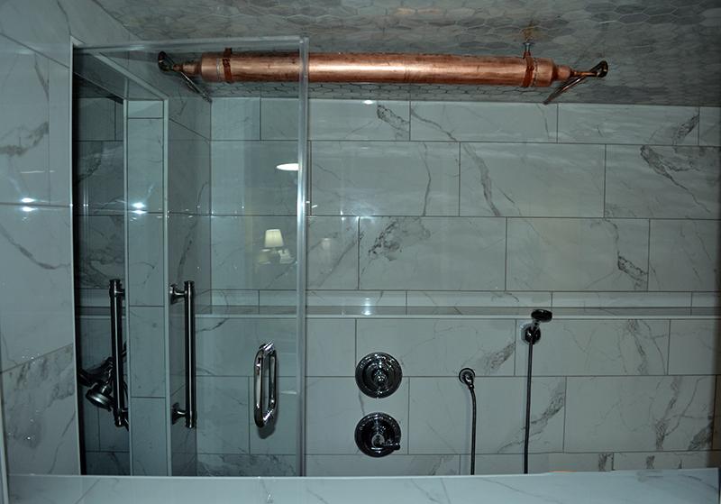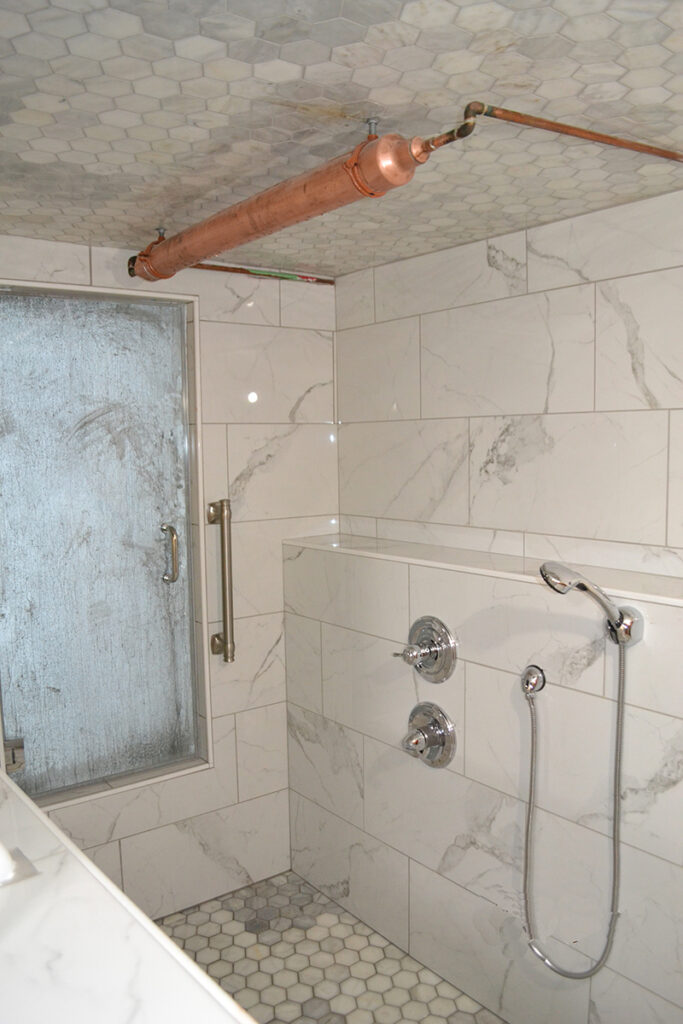 - Roman Spa (Steam Room/Shower + Bathroom): Full Bath Marble Steam Room/Tub/Shower combination accommodates up to 2. It has a separate glass door, steps out into another open marble shower. This shower has an overhead copper shower head, plus hand-held adjustable shower head. Walk-out from shower area to the sink/toilet area.
