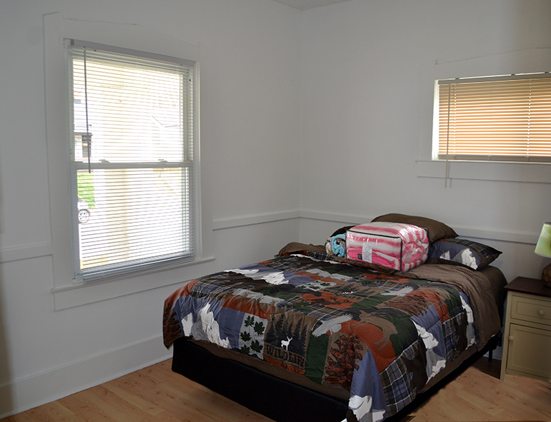 Upper Level Front Bedroom has privacy with double bed, linens/comforter provided. Windows for natural light, plus small closet area, nightstand, lamp and full-length mirror. Located off Living Room and near Bathroom and Kitchen.