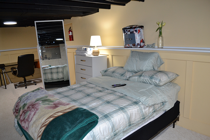 - Upper Level-Bedroom 2: Also private room with double bed, linens/comforter provided. This bedroom has direct access to Bathroom and Kitchen. Equipped with mirror, nightstand, plus closets. It has one window for natural light.