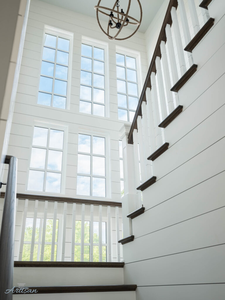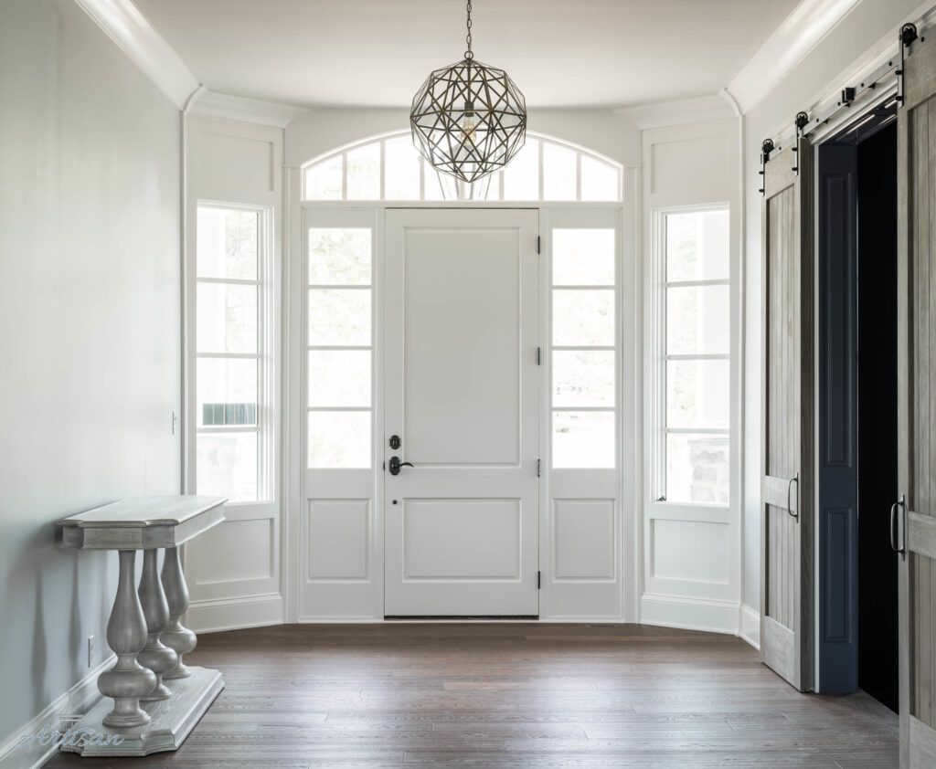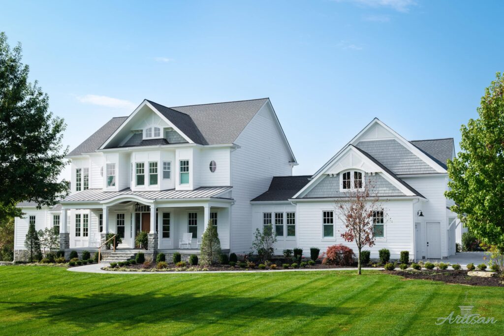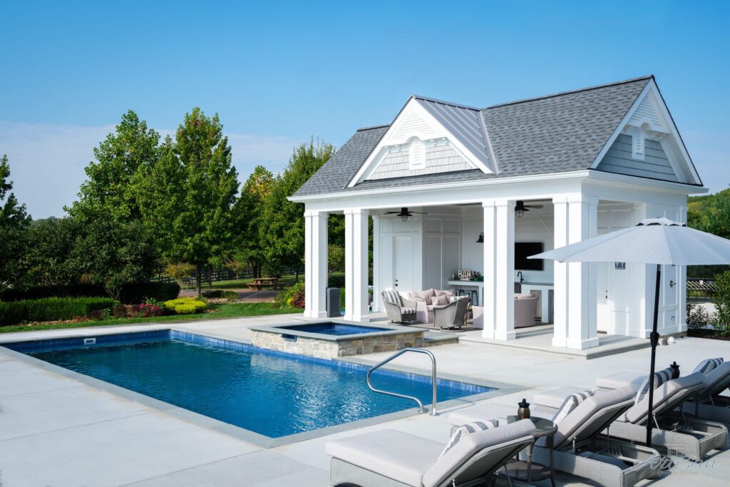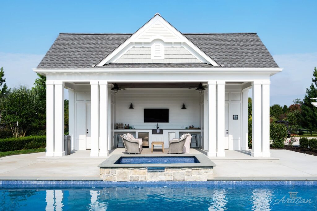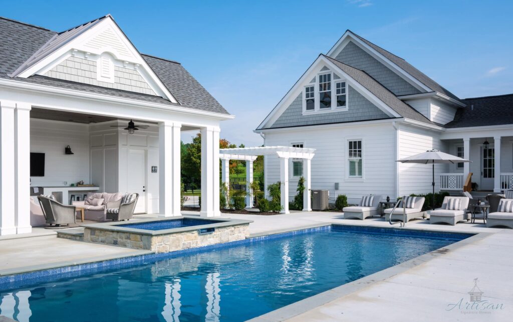 The first floor seamlessly blends indoor and outdoor living with large openings that lead to outdoor entertaining areas such as a large walkout patio with dining table, sitting area with TV, and a fireplace. A Blackstone grill and fire pit table branch off the patio beside the heated pool and spa.