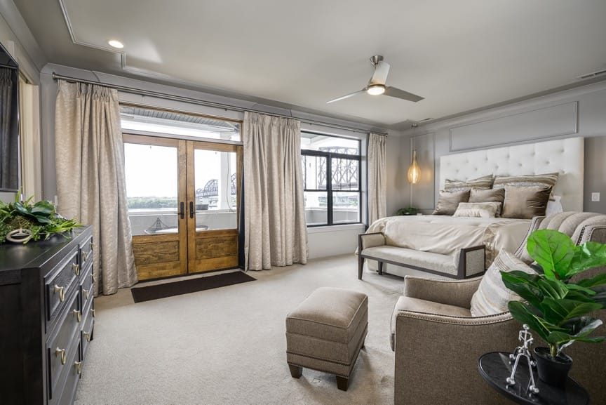 Primary suite with king bed, balcony, and spa-style bath. Additional guest suites provide comfortable accommodations and modern finishes.