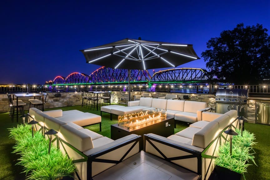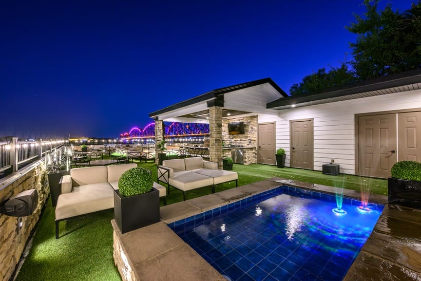 Rooftop sanctuary featuring a wading pool, full bar, outdoor kitchen, and half bath—ideal for Derby celebrations and elevated gatherings.